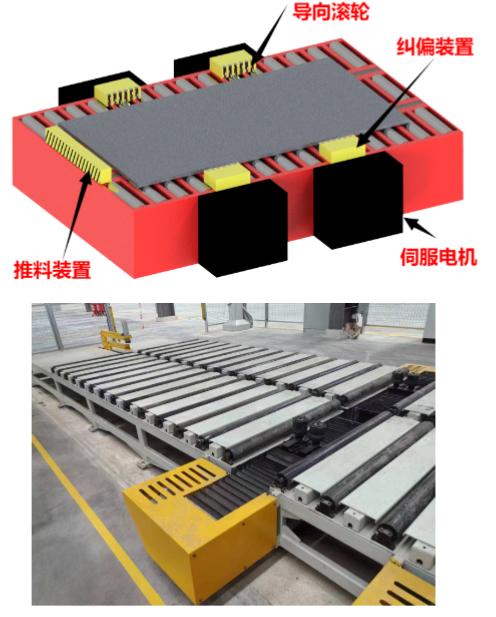 送料平臺工作原理: 本送料平臺主要是配合卷板機(jī)卷制操作而設(shè)置的。由真空吸盤將板料搬運(yùn)到該送料平臺上,由平臺上的 2 套對料裝置將板料居中校正,再由伺服電機(jī)減速機(jī)驅(qū)動鏈輪帶動推料裝置推動板料進(jìn)入卷板機(jī),全程由伺服電機(jī)控制精度。